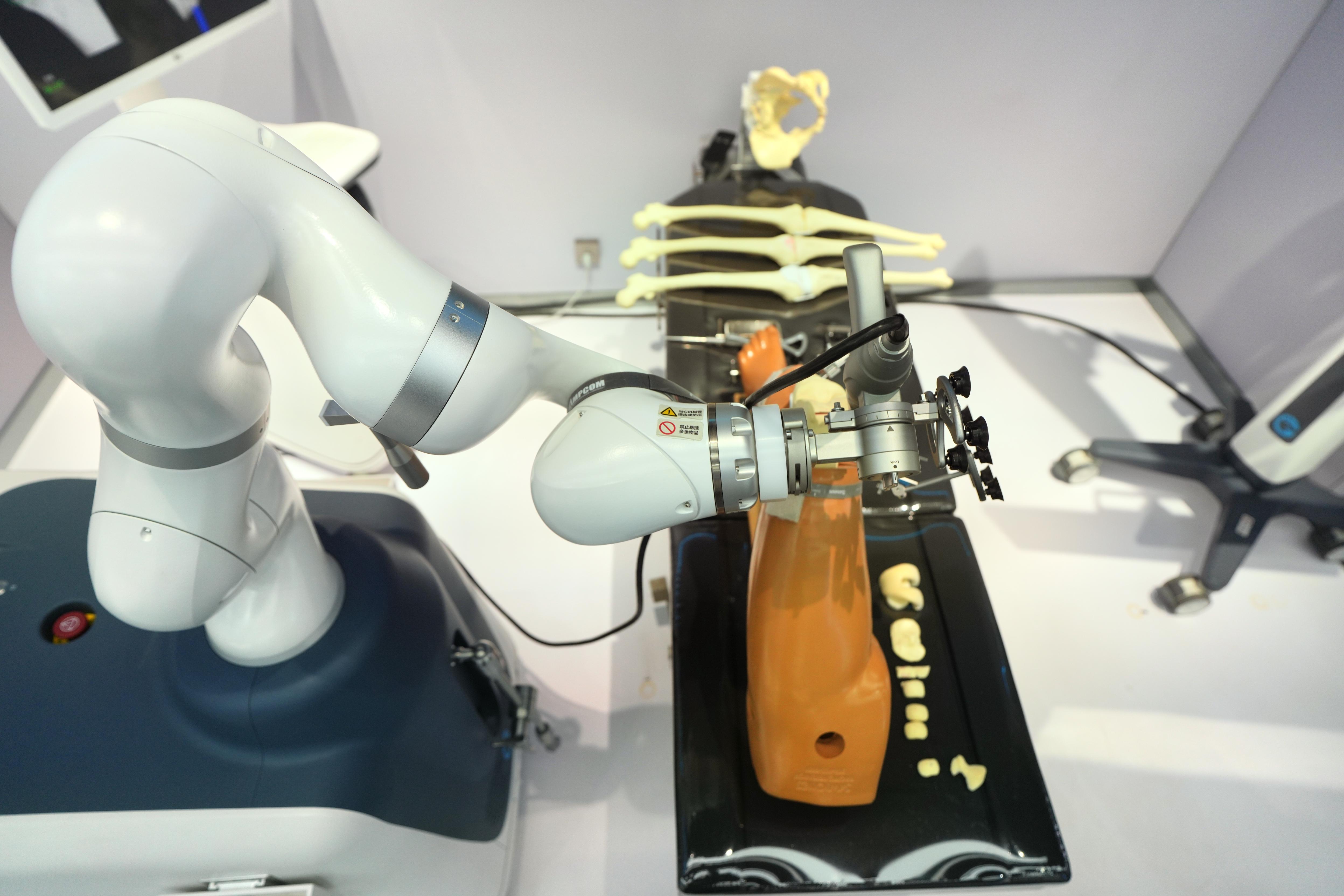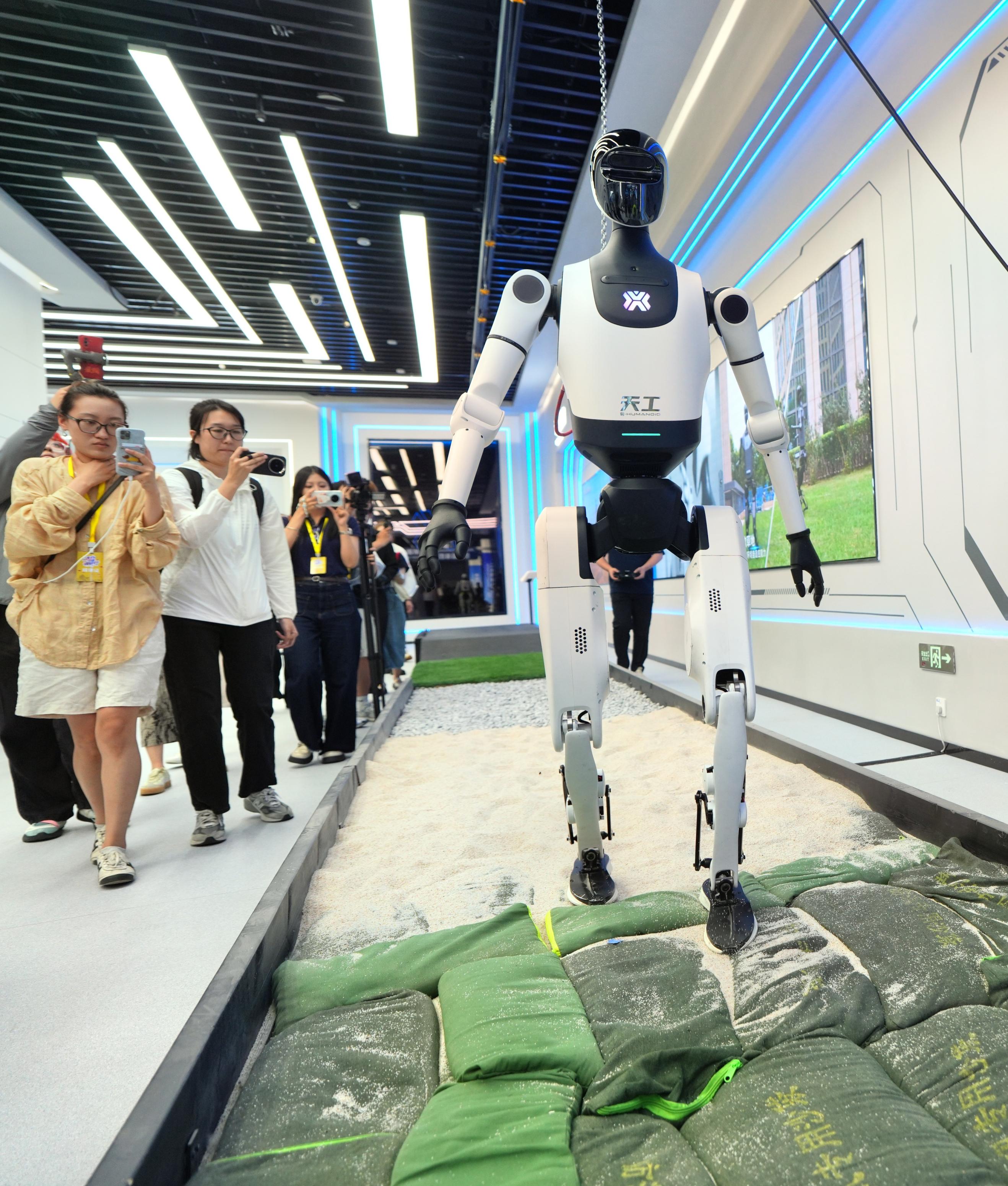 引来现场媒体记者最多惊叹声的,当属能踢足球的人形机器人。“好球!进了!”在四层展厅,一场别开生面的机器人足球争霸赛火热上演,足球机器人完成精准射门动作后,还会高举机械臂庆祝。两台机器人为了争球还会高强度对抗,金属碰撞声时不时传来,但机器人仍能保持稳定。